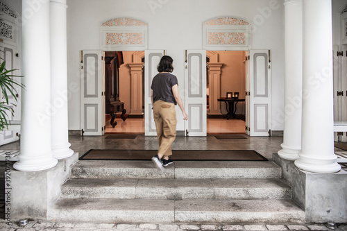 woman walking into manour house style boutique hotel in Colombo