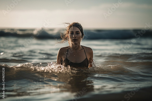 woman was swimming in the ocean, fictional location. Generative AI