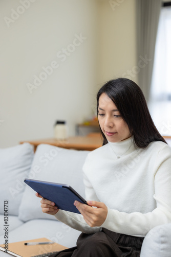 home, house, female, woman, watch, tablet, computer, homemaker, info, communication, to sit, white, modern, network, happy, cyberspace, lifestyle, relax, pretty, beautiful, smile, life, young, asia, asian, chinese, 1, girl, taiwanese, indoor, inside, living, room, sofa, couch, pillow, work, read, online, check, use