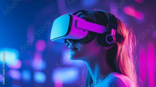 Woman wearing a virtual reality headset with pink and blue neon lighting.