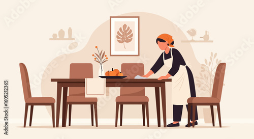 Woman Wearing Apron Cleaning Wooden Table In Dining Room Illustration