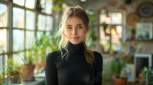 woman, girl, female, portrait, model, fashion, style, clothing, outfit, black, turtleneck, sweater, long, sleeve, hair, blond, smile, face, eye, green, plant, window, room, interior, home, cosy, casual attire, comfortable, natural, light, daylight, indoor, indoor, standing, pose, looking, camera, young, adult, people, person, beautiful, pretty, attractive, wear, apparel, modern, contemporary, stylish, trendy