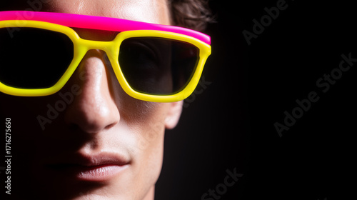 Woman wearing bright yellow and pink neon sunglasses against dark background. Colorful party eyewear creates vibrant nightclub fashion statement. Trendy lifestyle portrait.
