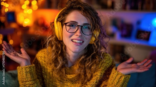 woman, person, earphones, yellow, goggles, eyeglass, smile, sweater, curly hair, hand, bokeh, light, background, home, interior, portrait, closeup, blue light, wall, bookshelf, shelf, picture frame, cosy, warm, joyful, casual attire, room, indoor, facial expression, youthful, entertainment, audio, listening, music, eye, front view, couch, seated, comfortable, relaxed, modern, digital, connectivity, technology, online