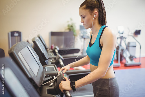 Woman wearing teal sports bra and gray leggings adjusting treadmill console at gym, copy space