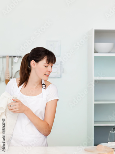 Woman wearing white apron standing at kitchen counter holding white dish towel near utensil rail