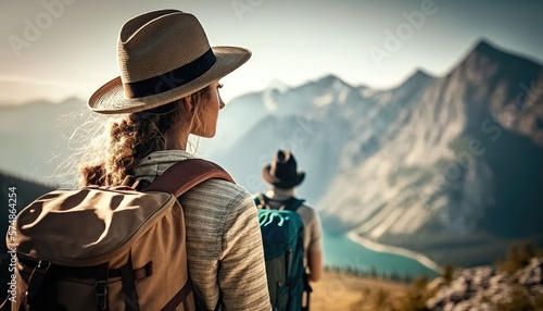 woman with a hat and backpack looking at the mountains and lake from the top of a mountain in the sun light, with a view of the mountains