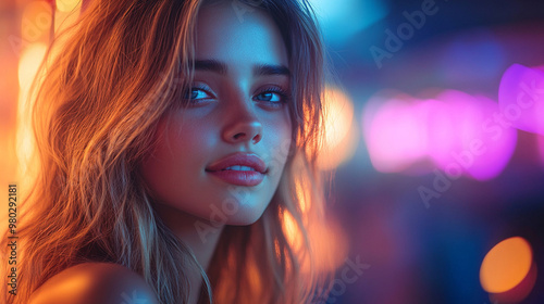 woman with a slender figure smiles joyfully, embracing the vibrant energy of a festival. Her carefree expression and confident presence symbolize freedom, beauty, and self-assurance in celebration