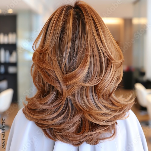 Woman with a voluminous blowout hairstyle, [blowout hair], [salon visit]