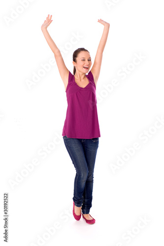 people, woman, young, casual attire, beautiful, attractive, girl, female, one person, teenage, teenage, teenage, teenage, smiling, happiness, smile, happy, cheerful, joy, joyful, caucasian, toothy, white background, studio shot, expression, young adult, isolated, positive, arms raised, winner, winning, success, excited, excitement, exciting, student, standing, full body, full-length