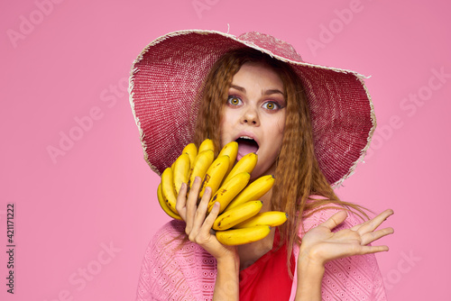 Woman with bananas in hands in hat exotic fruits lifestyle pink background