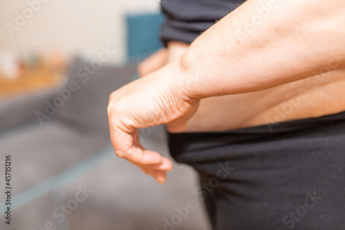 woman with belly struggling to dress pants. Concept of excessive weight, obese female, dieting and overweight problems.Closeup.Side view.