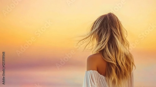 woman, sunset, beach, ocean, hair, blond, golden hour, back, view, silhouette, summer, warm, relaxation, peaceful, serene, calm, tranquil, soft, light, orange, pink, yellow, sky, horizon, seascape, coastal, nature, landscape, female, girl, outdoors, travel, vacation, freedom, solitude, contemplation, thoughtful, hope, dreamy, romantic, beautiful, elegant, white, dress, long hair, wind, flowing