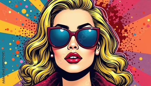 Woman with blonde hair wears sunglasses. She has red lipstick and wears a maroon jacket. Background is colorful pop art style with dots and rays.