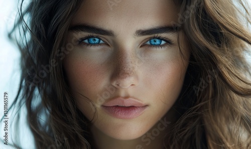 Woman with blue eyes, close-up, natural beauty, outdoor setting, soft lighting