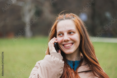 woman, braces, talking, mobile phone, communication, red hair, park, city, conversation, mobile, technology, device, connection, smartphone, call, leisure, activity, relaxation, portrait, nature, chatting, discussion, speaking, dialogue, red-haired, mobile phone, chat, phone, tied-up, horizontal, copy space, people, smiling, 1, person, smile, face, outdoors, phone