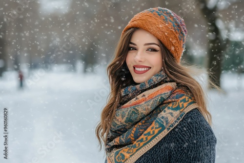 woman, brown, hair, hat, orange, snow, winter, cold, smile, face, eye, foulard, blue, white, falling, flake, sweater, happy, cosy, fashion, outdoors, beautiful, portrait, season, landscape, nature, background, weather, frosty, chilly, wintery, glacé, girl, wind, chilling, bright, brightly, sunny, day, fresh, cool