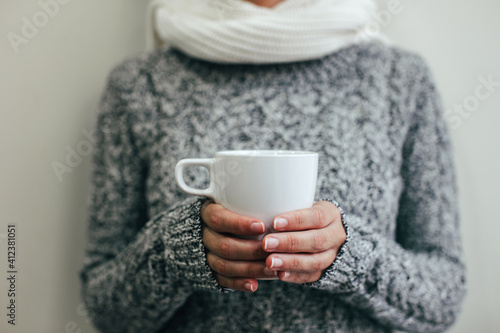 background, beverage, black, chunky, closeup, clothes, hot drink, cosy, cup, drink, female, hand, holding, horizontal, hot, indoor, jumper, knit up, knitted, mug, foulard, season, seasonal, sweater, texture, wall, warm, white, winter, woman, wool, caucasian, lady, person, people, adult, adult, 30s, grown-up