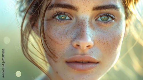 woman with clear, luminous skin, her eyes captivating and expression serene