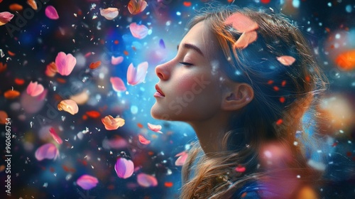woman, eye, closed, shower, flower petals, flower, blossom, pink, red, orange, blue, background, blur, bokeh, soft, light, dreamy, magical, aethereal, romantic, delicate, fragile, beauty, gentle, peaceful, serene, calm, portrait, face, hair, blond, skin, profile, feminine, graceful, artistry, illustration, digital, art