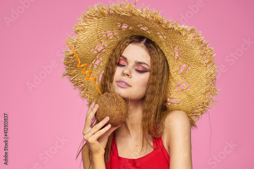 Woman with coconut cocktail in straw hat exotic vacation summer pink background