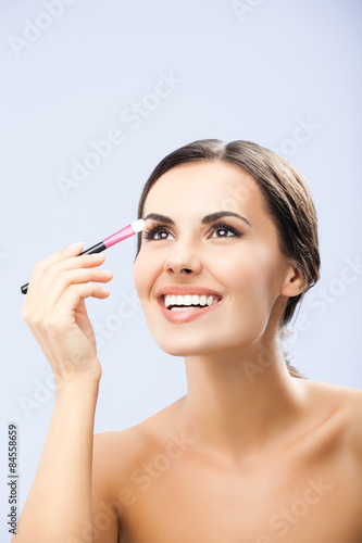 brush, 1, only, female, woman, woman, girl, young, make-up, constructed, up, people, person, application, apply, appealing, put, beautiful, beauty, pretty, visage, cosmetic, covering, cosmetology, grey, grey, background, face, facial, touch, happy, head, human, portrait, smile, smiling, 1, over, caucasian, european, copy space, 20s, 20