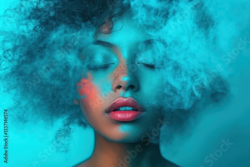 woman, curly hair, smoke, colourful, eyes closed, aethereal, atmosphere, portrait, beauty, creativity, expression, serenity, calmness, colours, modern, fashion, coiffure, make-up, style, emotion, dreamy, concept, natural, mood, art, young adult, creative, digital, lifestyle, female, high-coloured, feeling, calming, surreal, abstract, scenic, unique