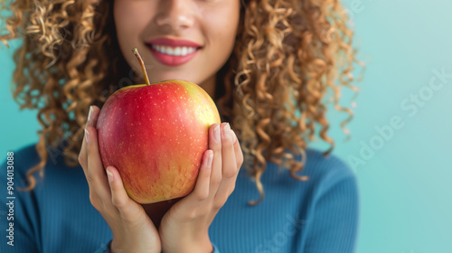 woman, curly, hair, hold, apple, holding, giant, concept, healthy, fresh, diet, nourishment, fruit, food, beauty, red, smile, eating, health, face, person, eat, hand, lifestyle, 1, smiling, happiness