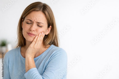 Woman With Discomfort Holding Her Cheek in a Bright Room While Experiencing Tooth Pain During Daytime Hours