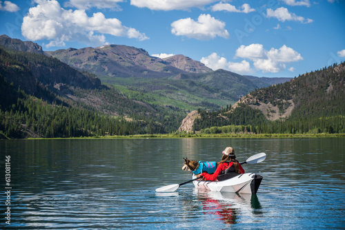 Woman with Dog Kayaking on lake San Cristobal in Colorado