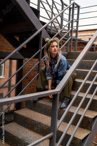 woman, dreadlocks, sitting, stair, industrial, metal, denim, relaxed, thoughtful, casual attire, style, fashion, urban, brick, outdoors, youth, contemporary, boot, architecture, railing, attitude, jean, trendy, lifestyle, expression, coiffure, modern, looking, alternative, unique, artistic, pensive, staircase, building, alone, solitude, individuality, personality, character, scene, natural, day, atmosphere, edgy