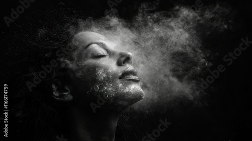woman, portrait, powder, face, black, white, dark, beauty, monochrome, dust, smoke, art, fashion, make-up, female, girl, hair, sensual, mystery, abstract, dramatic, emotion, expression, shadow, light, contrast, closeup, style, elegant, glamour, mood, creative, artistic, design, photo, studio, background, conceptual, fantasy, surreal, dream, imagination, fine art, contemporary, body, skin, lip, eye