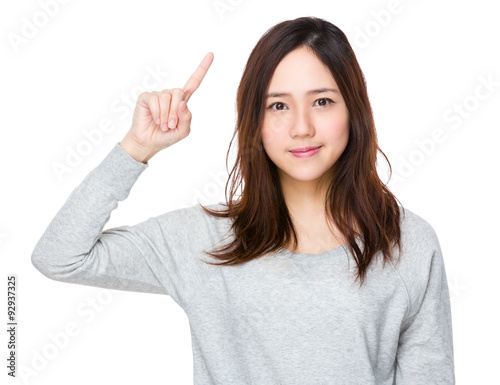 woman, lady, girl, female, japanese, korean, chinese, asia, asian, china, taiwanese, casual attire, wear, tee, long, sleeve, adult, simple, blank, design, logotype, finger, point, out, up, thought, new, index, direct, touch, show, pointer, sell, sale, discount, isolated, white, background, people, person, portrait, 1, young, mature, grey, beautiful, pretty, smile, happy