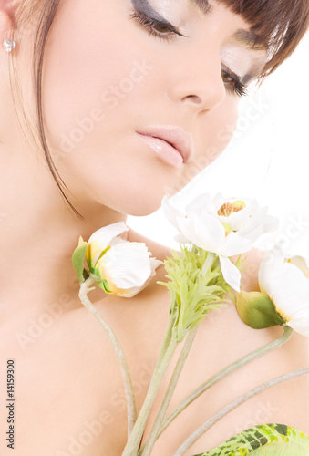 woman, girl, flower, face, white, beauty, visage, make-up, brunette, attractive, beautiful, clean, fresh, freshness, harmony, health, healthy, living, lovely, natural, pretty, pure, purity, skin, smooth, soft, care, vitality, wellness, well-being, nice, sweet, young, female, alluring, bright, lady, looking, portrait, closeup, romantic, caucasian, honed, good, shape, holding, cute, balance, calm, relaxed
