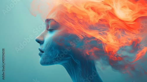 woman, flowing, abstract, art, digital artwork, illustration, portrait, beauty, fashion, style, colourful, vibrant, energy, passion, fire, smoke, aethereal, surreal, dreamlike, fantasy, imagination, creative, artistic, background, design, modern, contemporary, blue, teal, gradient, profile, serene, peaceful, calm, calmness, inspiration, artwork, digital illustration