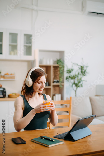 remote, laptop, woman, freelance, earphones, cosy, kitchen, living, room, home, working, breakfast, hot drink, digital, notebook, lifestyle, modern, casual attire, workspace, online, cyberspace, relax, wireless, technology, healthy, food, drink, sofa, creative, productivity, independent, comfort, smart, entrepreneur, streaming, browsing, learning, study, connection, communication, office, success, web log, content, video, social, marketing