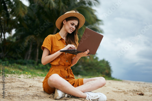 laptop, computer, woman, business, female, girl, young, person, office, work, freelance, screen, network, summer, vacation, tree, model, outside, writing, travel, holiday, nature, beach, tropical, writer, sun, landscape, grass, mrs, island, enjoy, palm, exotic, freelancer, technology, lifestyle, cyberspace, concept, beautiful, ocean, media, device, wi-fi, water, sea, relax, outdoors, enjoying, dress
