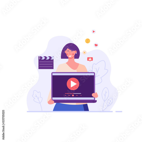 Woman with laptop using and watching streaming service with clapper. Streaming cinema concept. Concept of video marketing, online cinema. Vector illustration for UI, web banner, mobile app