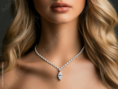woman, blond, hair, elegant, diamond, necklace, pendant, luxury, sophistication, jewellery, fashion, style, glamour, beauty, portrait, closeup, accessory, gemstone, sparkle, shine, opulence, chic, refined, posh, exquisite, feminine, delicate, alluring, graceful, polished, radiant, stunning, decorative, high-end, glamourous, fashionable, tasteful