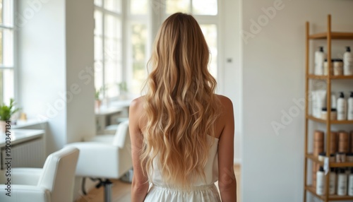 Woman with long blonde wavy hair stands in a bright modern hair salon. She wears a white dress, looking forward. Haircare products are visible on a shelf.