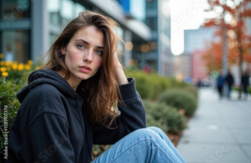 woman, female, city, park, autumn, fall, casual attire, relaxed, young, adult, model, fashion, lifestyle, urban, street, nature, foliage, tree, modern, building, architecture, leisure, sitting, pose, contemplative, expression, trendy, comfortable, environment, shot, candid, natural, light, scenery, background, greenery, colours