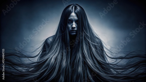 woman, girl, female, hair, long, flowing, dark, blue, background, face, eye, coiffure, mysterious, shadow, portrait, moody, model, beauty, expression, serious, pose, looking, straight, fantasy, studio, light, dramatic, artistic, intense, closeup, aethereal, shadow, silhouette