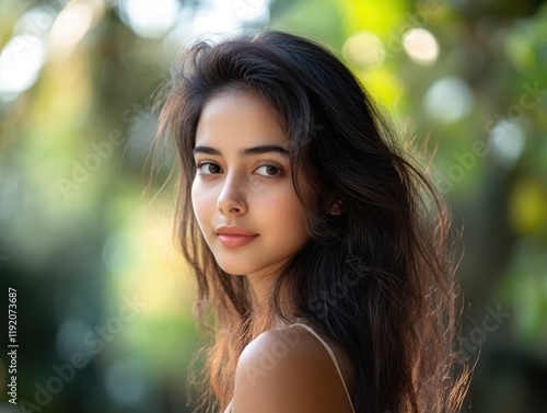 confident, woman, long hair, portrait, blur, fashion, beauty, lifestyle, empowerment, serene, nature, elegance, expression, candid, femininity, sunlight, park, carefree, summer, stylish, vibrant, relaxed, charisma, tranquil, greenery, confidence, allure, movement, gaze, standing, dreamy, personality, bokeh, chic, youthfulness, portraiture, inspiring, natural, smiling, admiration, scenery, engagement, warmth, picturesque