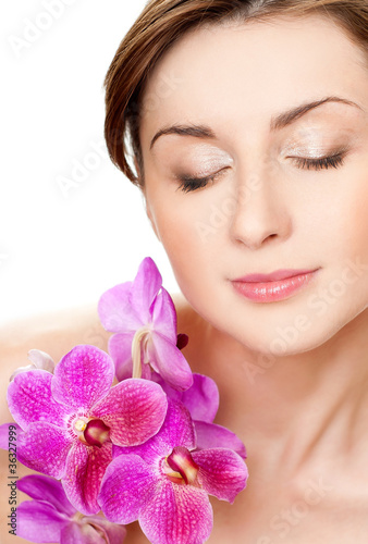 adolescence, aromatherapy, attractive, beautiful, beauty, body, bright, care, clean, closeup, complexion, cosmetic, elegance, face, female, femininity, flower, freshness, harmony, health, isolated, leisure, lip, luxury, make-up, naked, nature, neck, 1, orchid, perfection, pink, relaxation, sensuality, serene, shoulder, skin, smell, spa, spring, tenderness, tranquil, tropical, woman, young