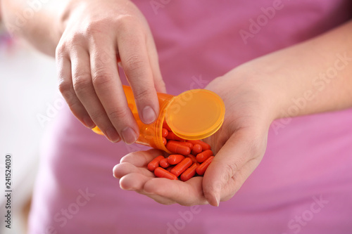 Woman with pills, closeup