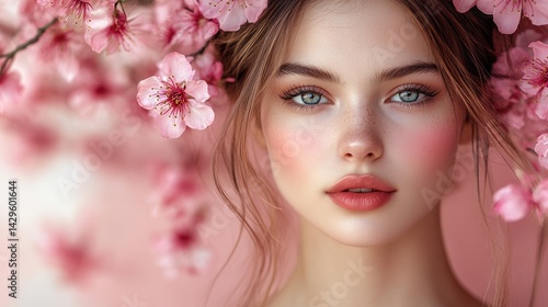 woman, portrait, flower, pink, floral, beauty, aesthetic, dreamy, face, head, hair, blossom, spring, feminine, beautiful, girl, model, make-up, skin, pastel, delicate, serene, tranquil, peaceful, elegant, graceful, artistic, digital artwork, illustration, fantasy, aethereal, light, romantic
