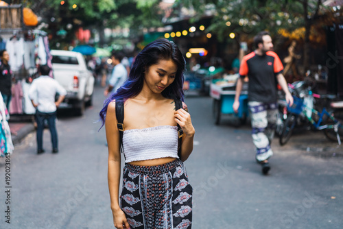 woman, pretty, street, young, beautiful, dreamy, portrait, hair, purple, asian, eastern, fashion, attractive, female, city, person, lifestyle, beauty, model, urban, glamour, style, stylish, casual attire, cute, bright, posing, trendy, standing, holiday maker, elegant, elegance, leisure, cool, trip, vacation, joyful, season, travel, horizontal, outdoors, walking, japanese, alternative