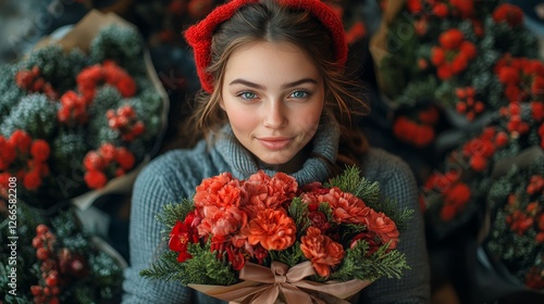 woman, girl, flower, bouquet, red, carnation, winter, beauty, portrait, pretty, smiling, happy, model, fashion, style, floral, arrangement, festive, holiday, christmas, romantic, love, nature, botany, plant, bloom, blossom, flower petals, leaf, greenery, colours, vibrant, cheerful, elegant, stylish, attractive, gorgeous, cute, young, adult, female, person, face, eye, hair, sweater, hat, headband, flower