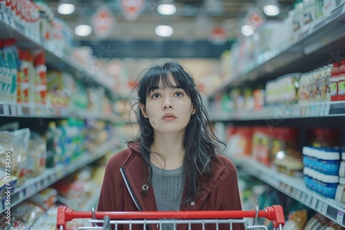 Woman with shopping cart comparing products in supermarket. Shopping concept.