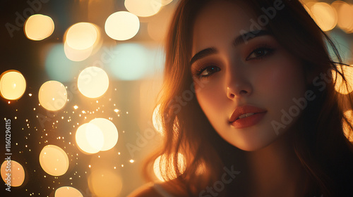 Woman with soft expression illuminated by warm bokeh lights in an evening setting